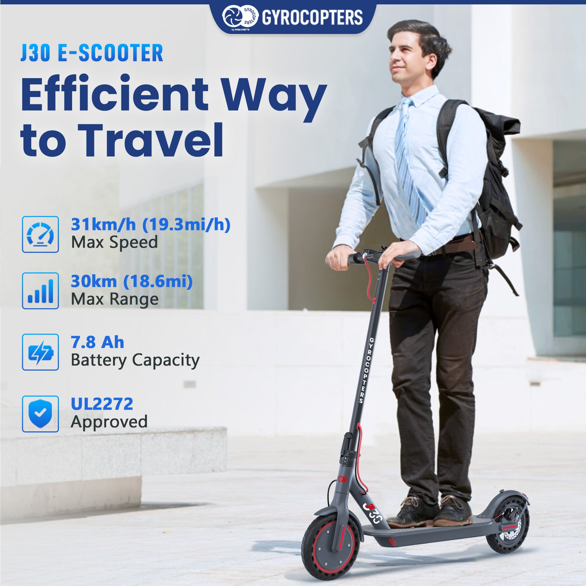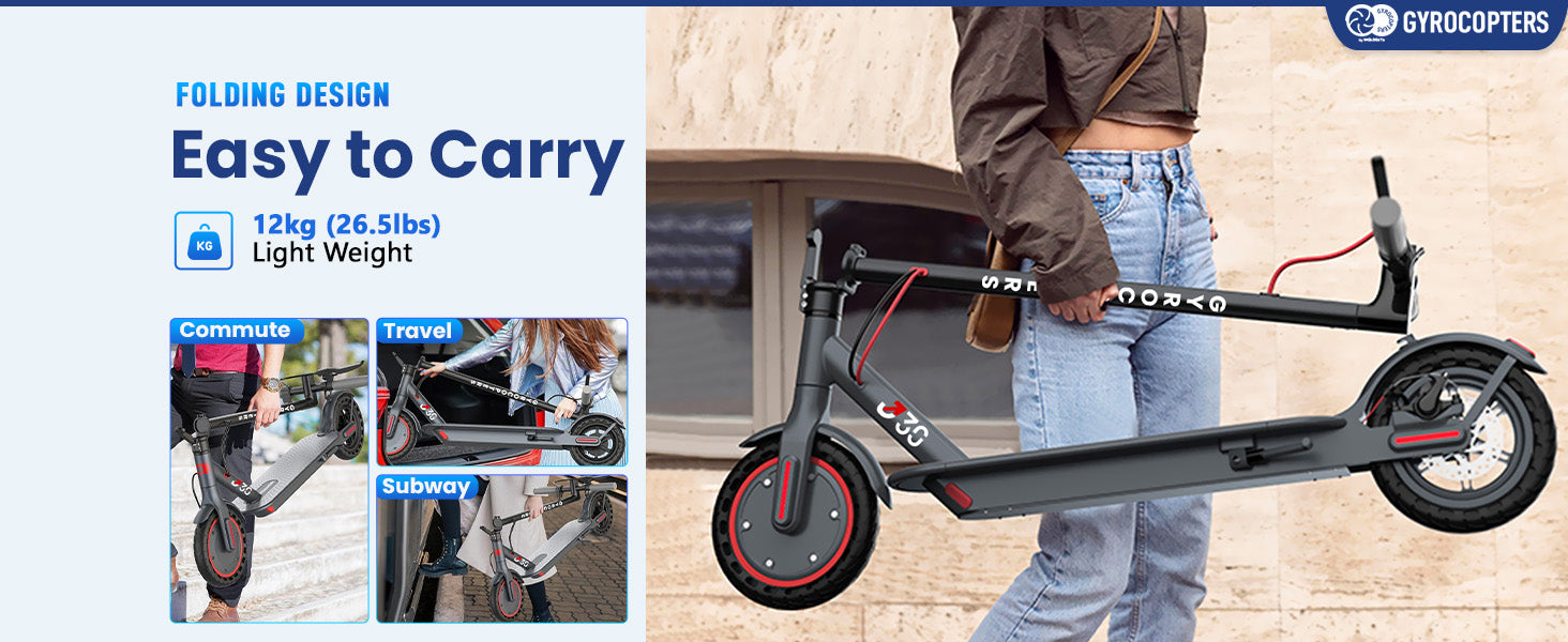 - Lightweight & Portable: With a compact 26.5 lbs (12 kg) weight, the Gyrocopters J30 escooter can be easily carried and folded for simple storage and public transport use.