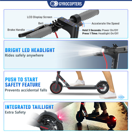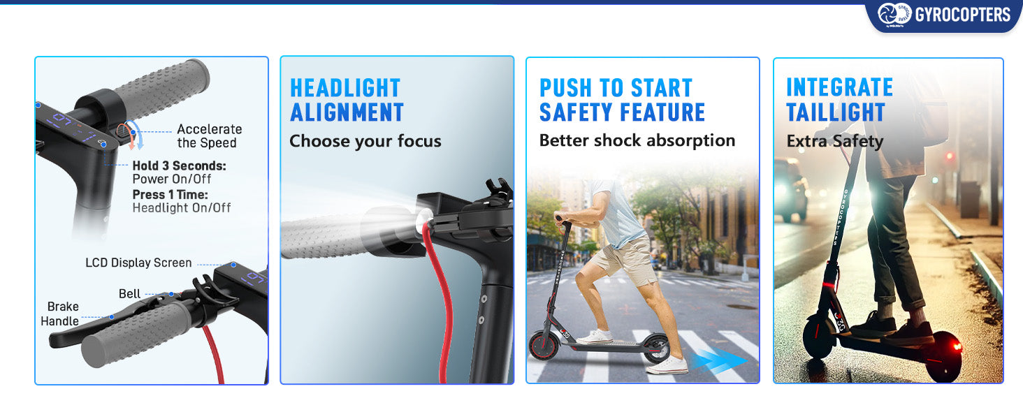 - Push to Start: For added safety and smooth operation, the Gyrocopters J30 scooter requires a gentle push before it accelerates.