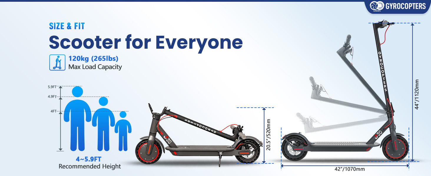 - High Load Capacity: The Gyrocopters J30 scooter supports up to 265 lbs (120 kg), making it suitable for riders of all sizes, from teens to adults.