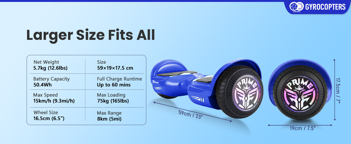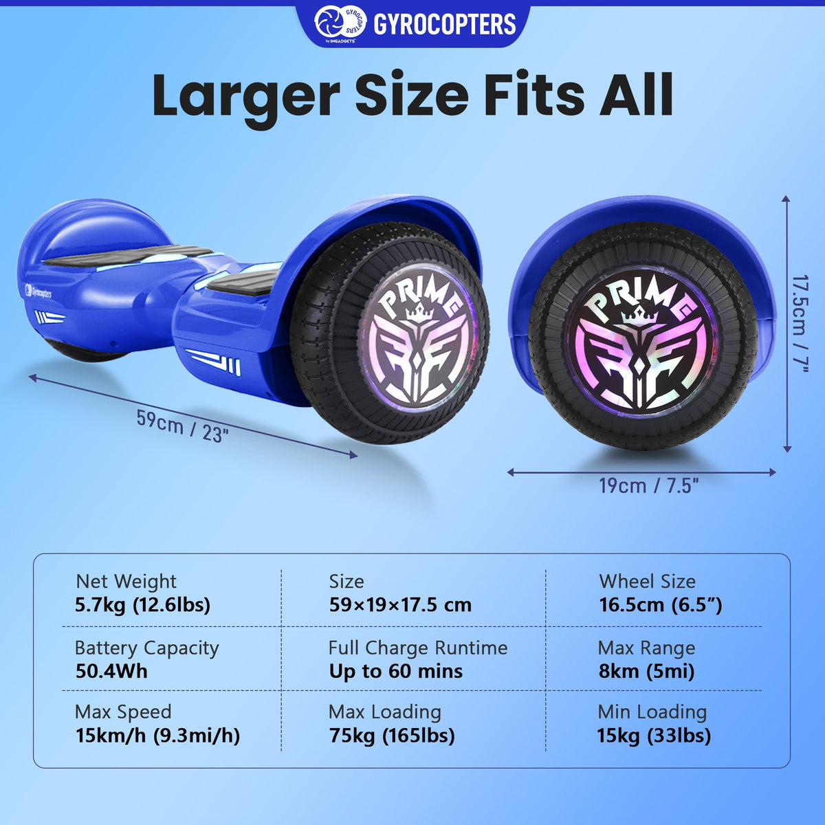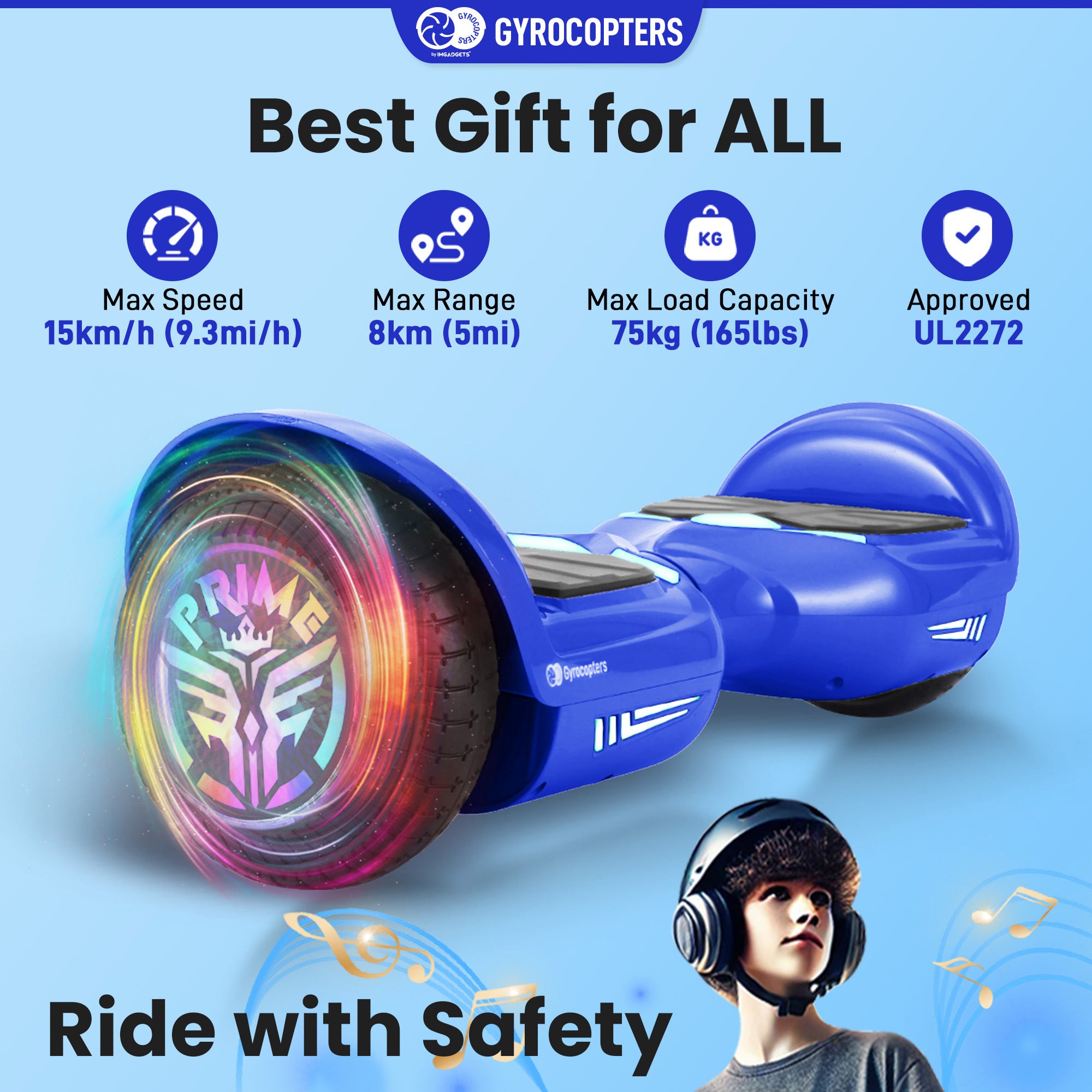 Gyrocopters Prime All New 2025 Hoverboard | Speed up to 15km/h | 300W Powerful Motor | 6.5” LED wheels | 165 lbs weight capacity | UL2272 certified with Wireless Music Speaker offering a range up to 8 km (BLUE)