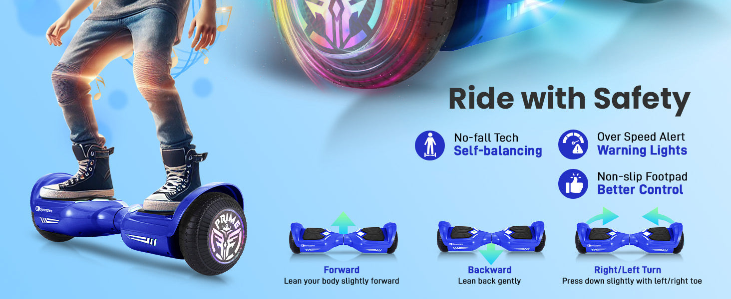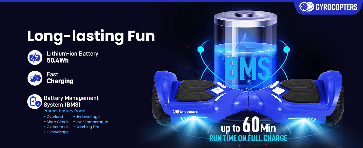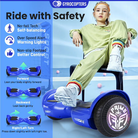No-Fall Technology: To enhance safety and optimize the riding experience for our valued customers, Gyrocopters Prime all-terrain hoverboard now incorporates advanced features. Equipped with upgraded and advanced gyro sensors, this hoverboard ensures automatic alignment, guaranteeing that the rider's balance remains uncompromised. This sophisticated technology consistently maintains a stable equilibrium, providing riders with a secure and smooth ride.