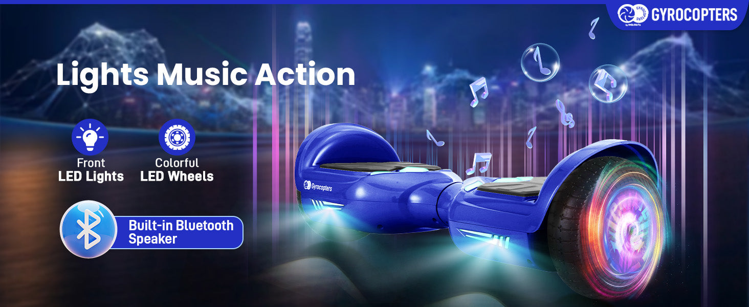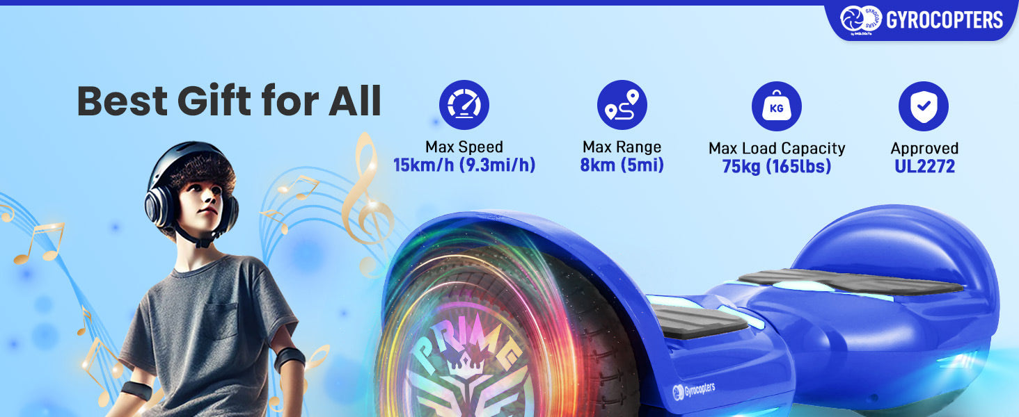 Safe and Fun: The Gyrocopters Prime Hoverboard self-balancing scooter has obtained the prestigious UL 2272 certification, meeting all government-mandated safety standards. It has excelled in various safety tests, including the cUL charger, cUL battery, and cUL hoverboard. The UL-certified battery incorporates an innovative, intelligent battery management system, enhancing overall performance. Take your riding experience to the next level with the built-in Bluetooth speakers, allowing you to enjoy your favourite songs while you ride. Also, let others know about your presence with the added sports car start-up sound. Instead of riding in silence, elevate your experience with a vibrant and musical ride.