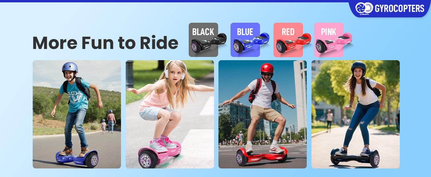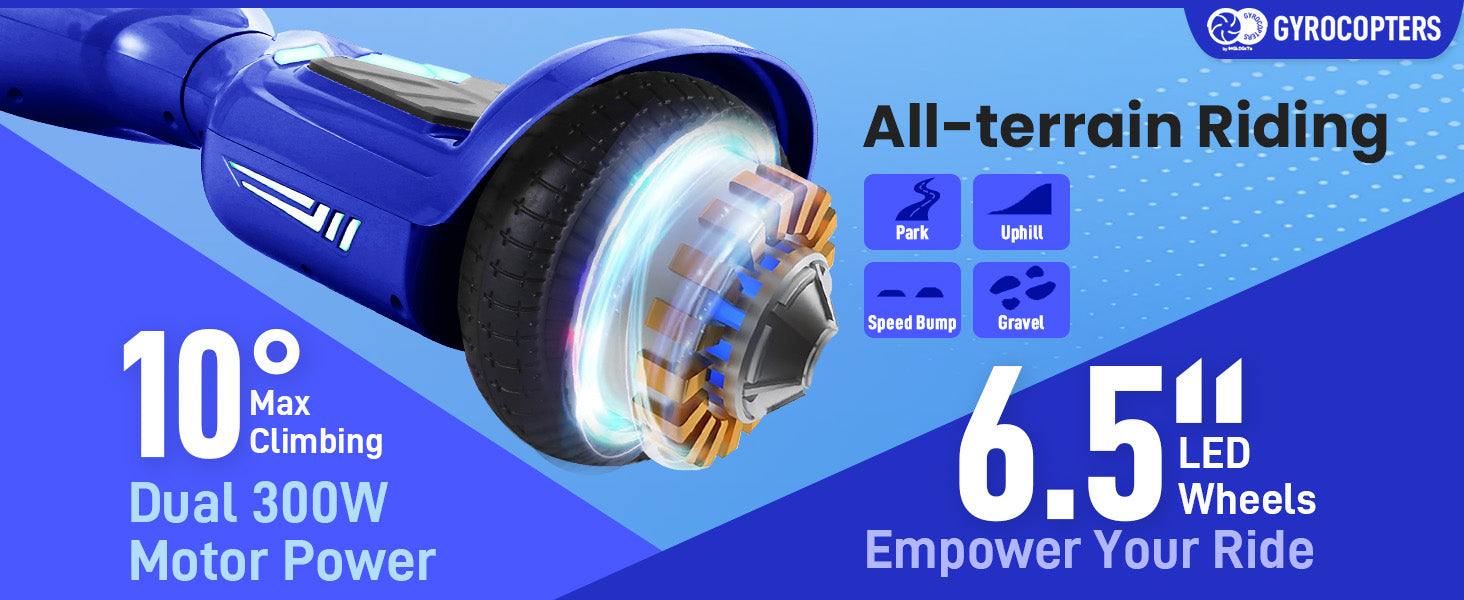 Long-Lasting LED Wheels: Enhance your riding experience with the Gyrocopters Prime hoverboard for kids and adults with attractive features and captivating built-in LED lights in the wheels, illuminating your path as you ride. Whether you're exploring cities, hiking trails, or parks, the hoverboard's rugged All Terrain Wheels ensure a thrilling and enjoyable ride indoors and outdoors. These specially designed-wheels add extra fun, making your adventures even more exciting.