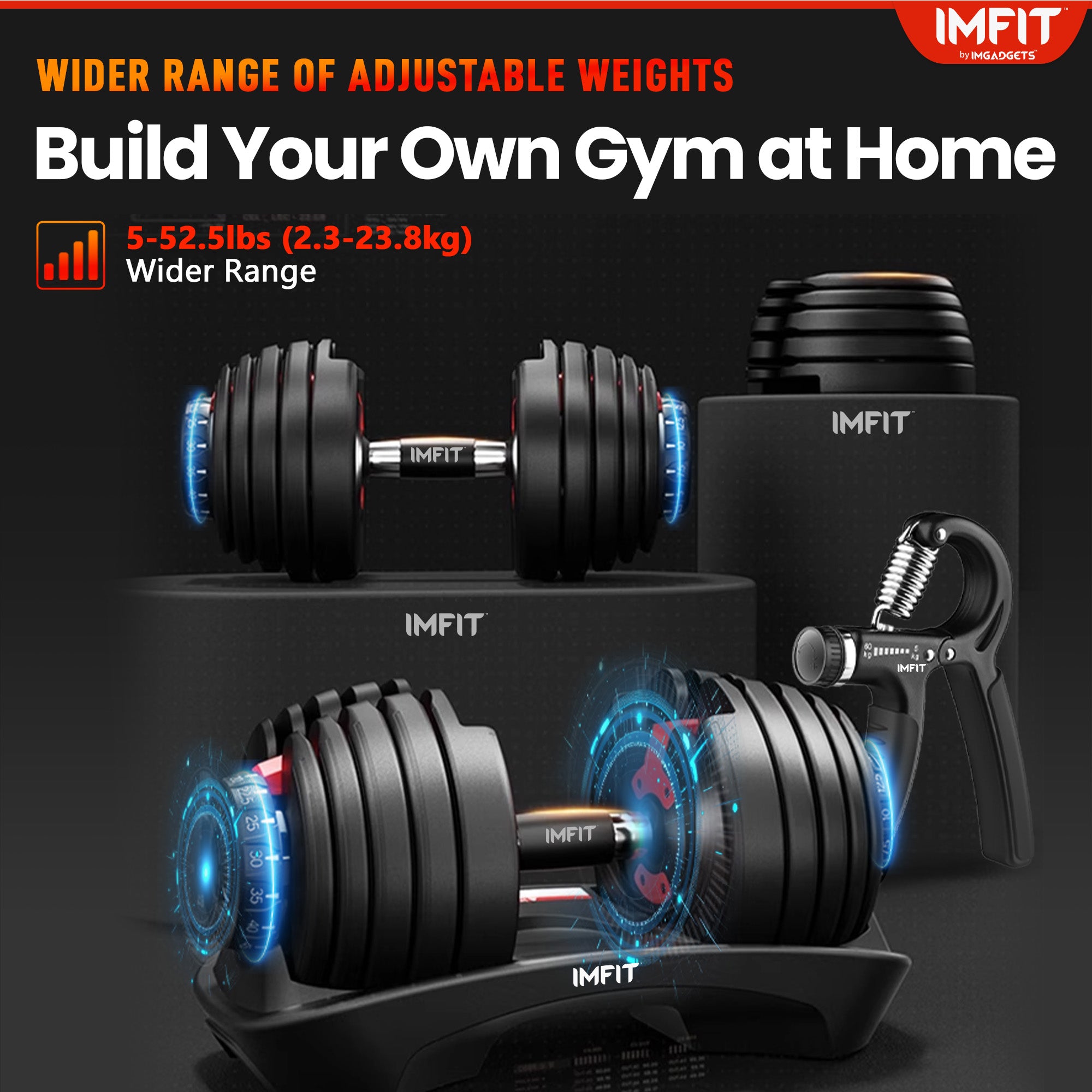 IMFit Adjustable Dumbbell Set (5 - 52.5 lbs) Single/ Pair(Set of 2) with Free Hand Grip | 15 Adjustable Weight Settings (Colour-Black) | Space Efficient Compact Design, Easily Switch Exercises