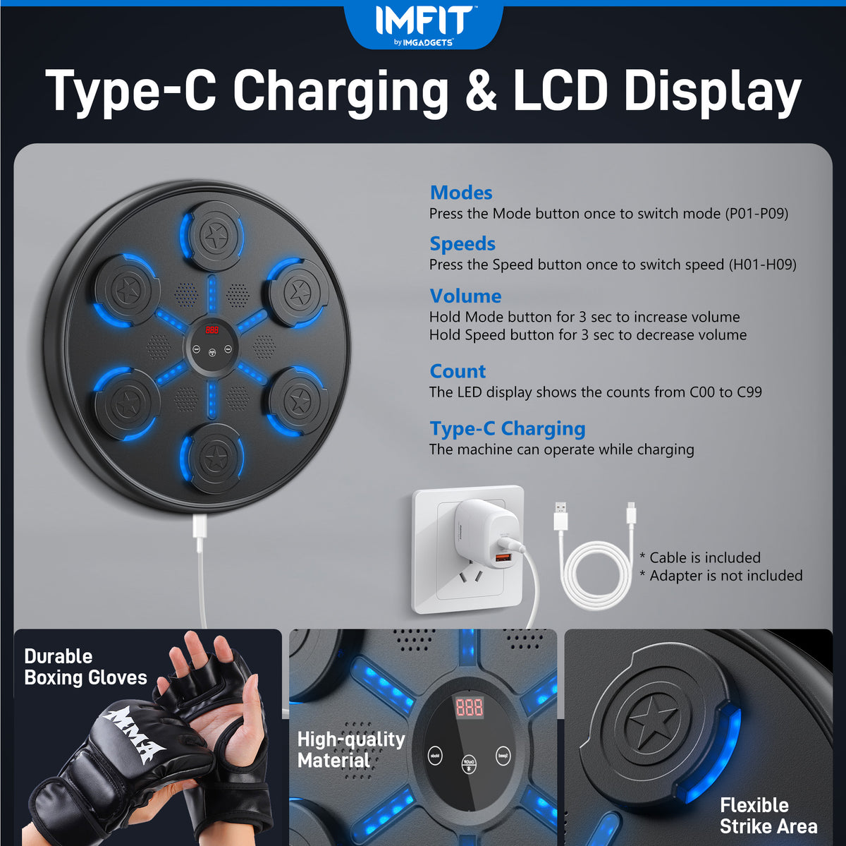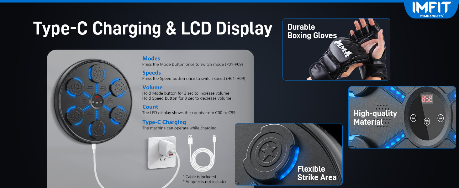 Smart Features: The IMFIT Music Boxing Machine features fast Type-C charging and a clear LCD, ensuring a seamless and effortless fitness experience with easy access to workout stats.