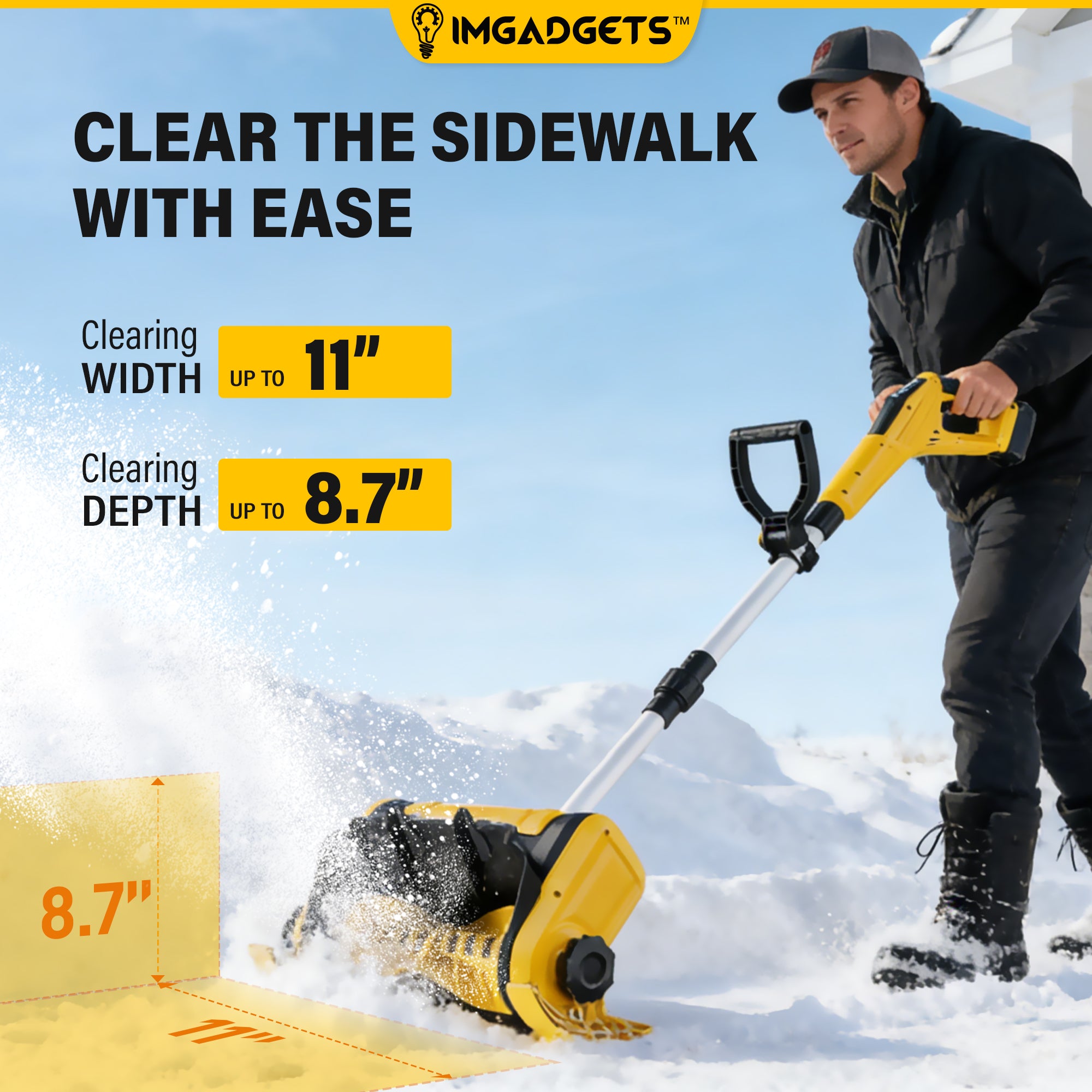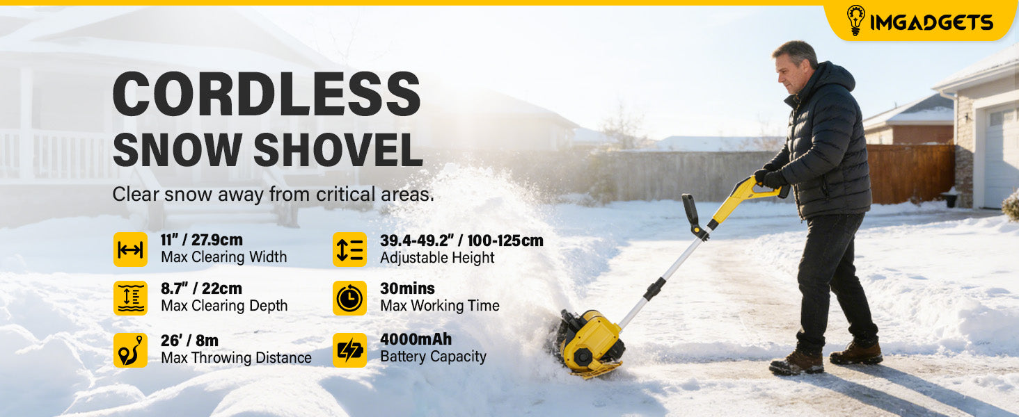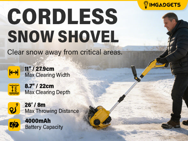 IMGadgets 11 inch Cordless Electric Snow Shovel for Driveways, Walkways, Sidewalks & Patios | UL approved | 4000mAh Battery | 26ft Throw Distance | Easy, Safe & Quiet Winter Snow Clearing Tool | Low-Maintenance Home Snow Shovel