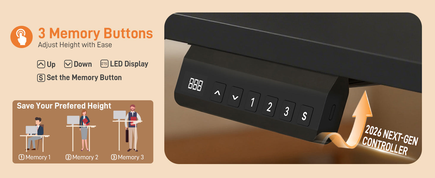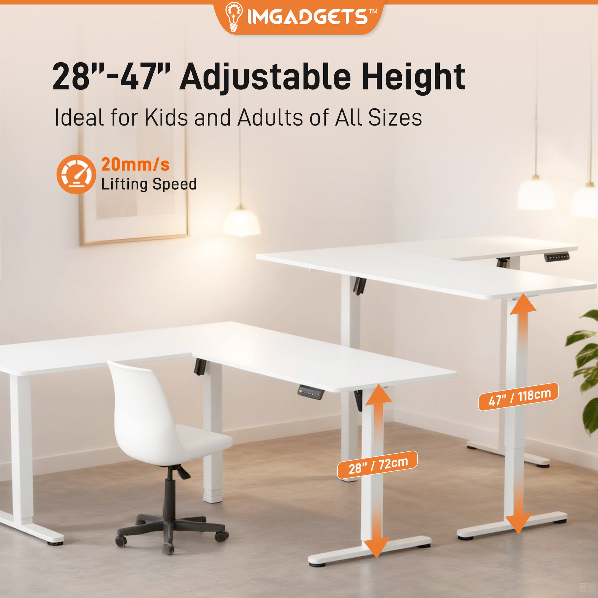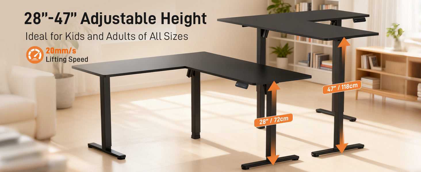 - Electric Height Adjustable Desk (28-47 inches): Switch effortlessly between sitting and standing with electric height adjustments from 28 inches up to 47 inches. The powerful lifting system moves at a steady 20 millimeters per second, ensuring smooth and reliable transitions every time.