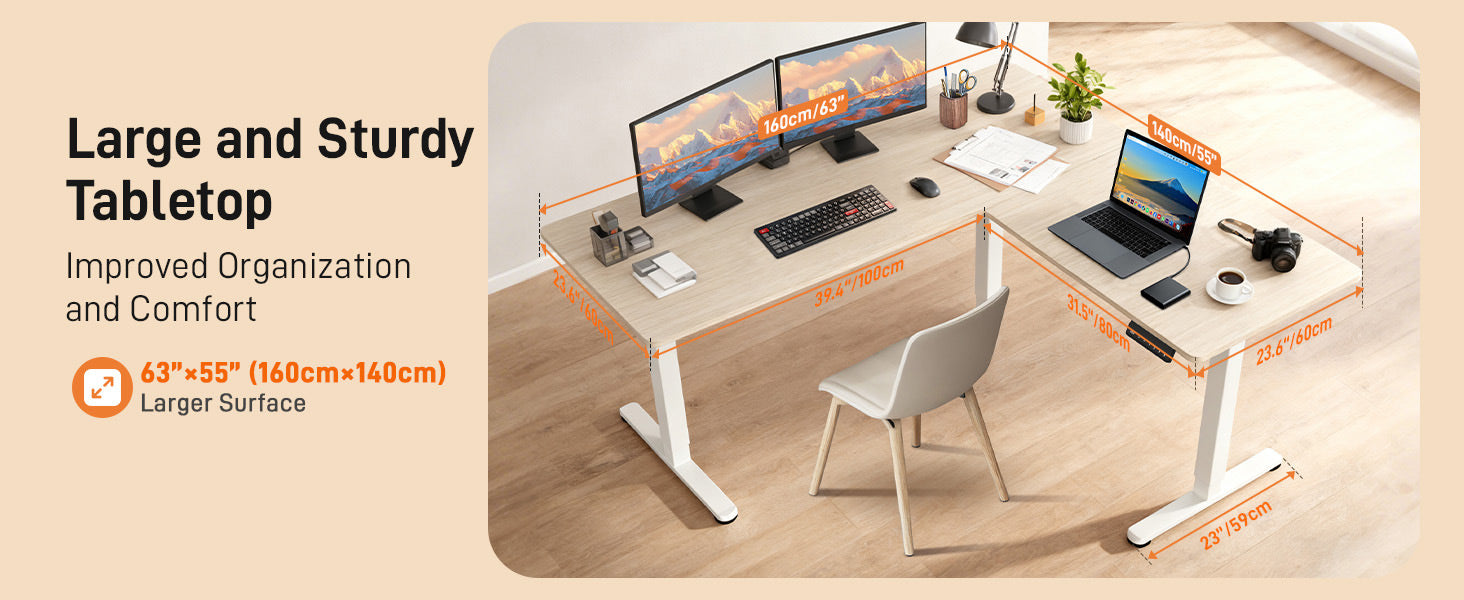 - Extra-Large L Shaped Workspace: Enjoy a generous 63 by 55 inch desk space that provides ample space for multiple monitors, laptops, and office essentials. Ideal for home office, dual monitor workstations, or creative professionals who need ample surface area.