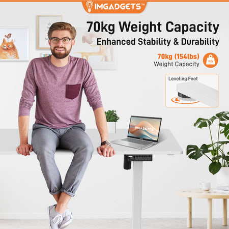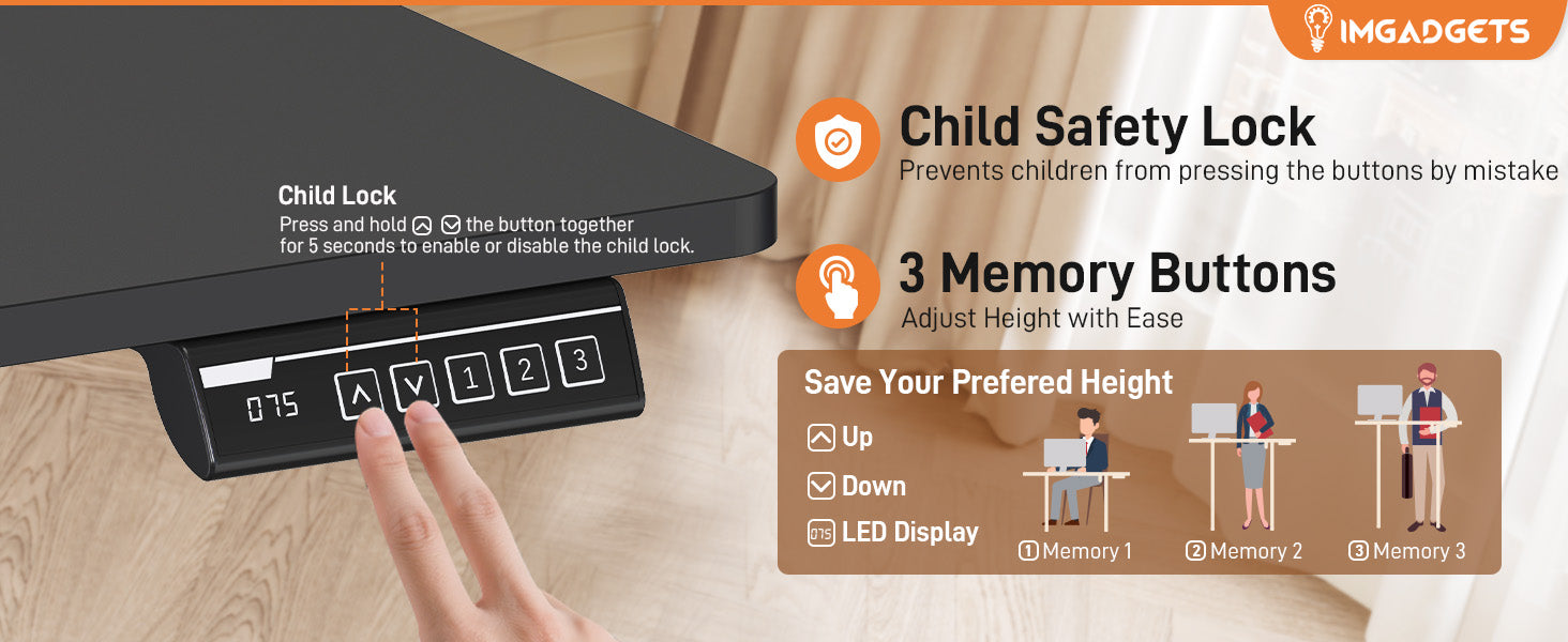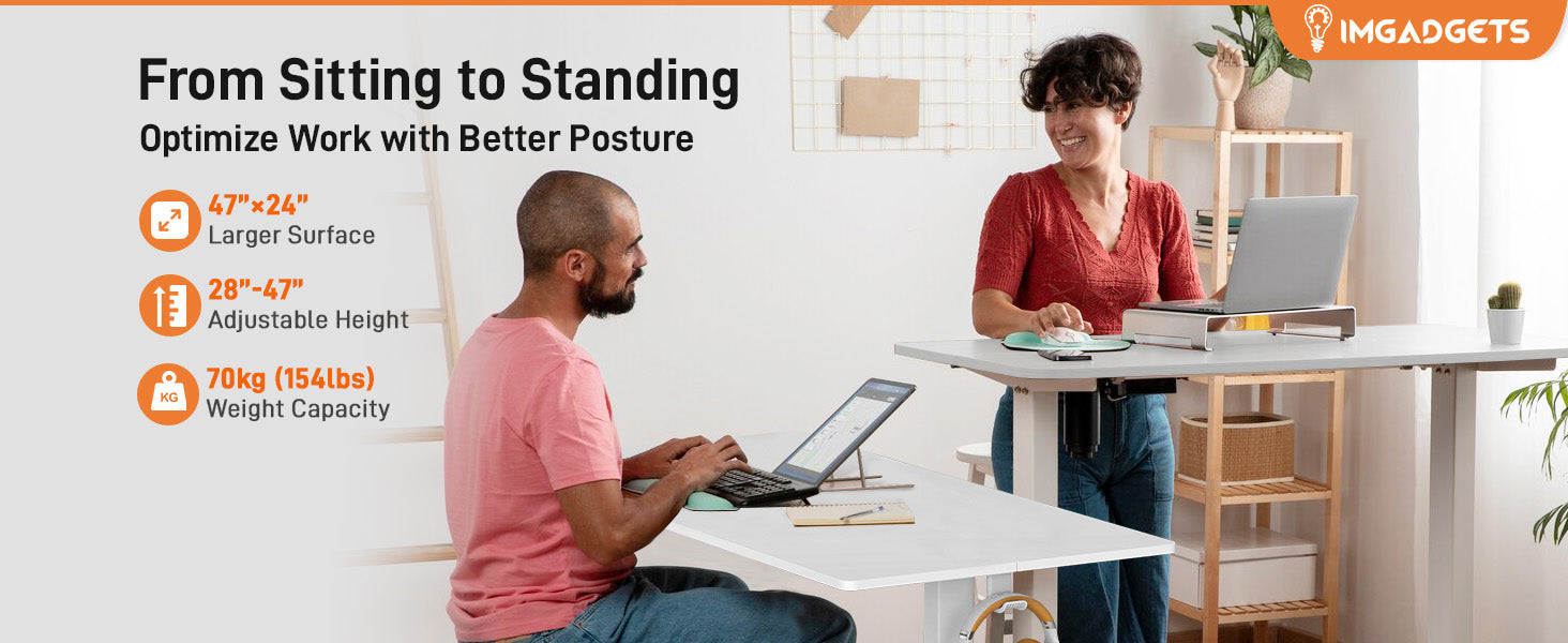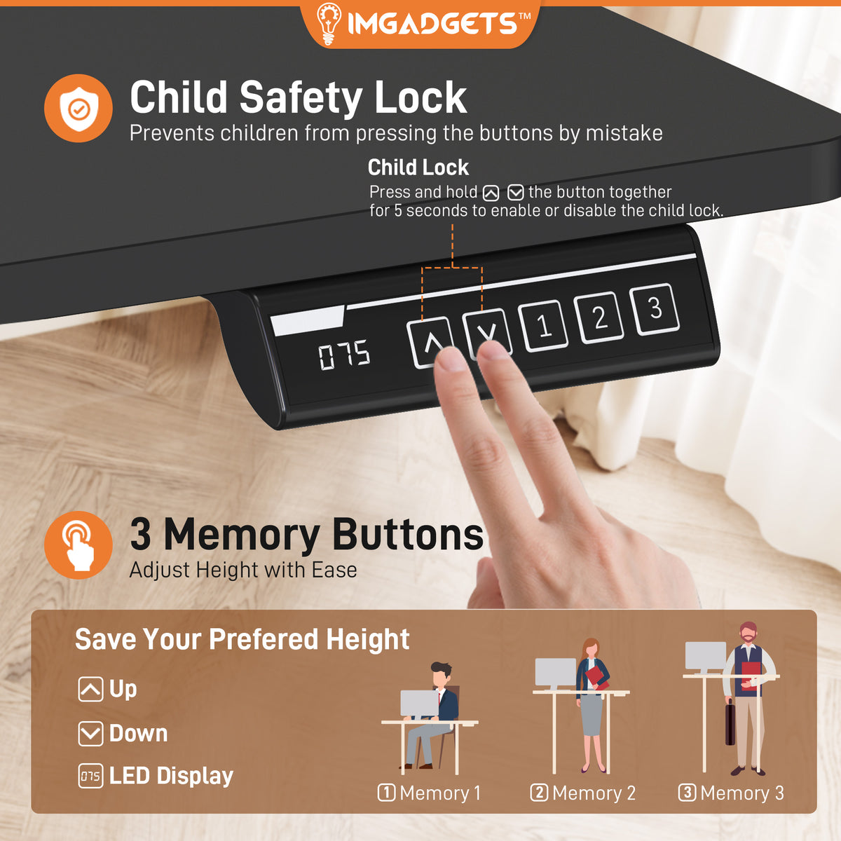 Elevate your workspace with the IMGadgets Electric Standing Desk, a versatile and feature-rich solution for home offices and professional setups. This sit-stand desk offers smooth electric height adjustments from 28" to 47", allowing you to seamlessly switch between sitting and standing. With a built-in 3 memory settings, you can save your favorite height settings for ultimate convenience. The anti-crash design ensures safe height adjustments, preventing damage to objects or the desk itself.