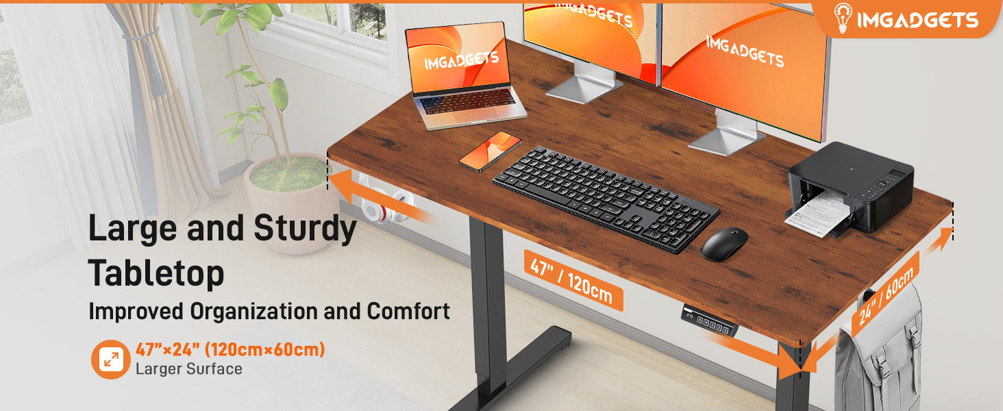 - Spacious and Ergonomic Computer Desk: The IMGadgets desk table features a 47" x 24" work desk surface, perfect for computer desks that accommodate 2-3 monitors and a laptop. Whether used as a work desk table, bed desk, or stand-up desk, it provides ample space for organized productivity. Two desk hooks keep headphones, bags, and other items within reach while maintaining a clutter-free workspace.
