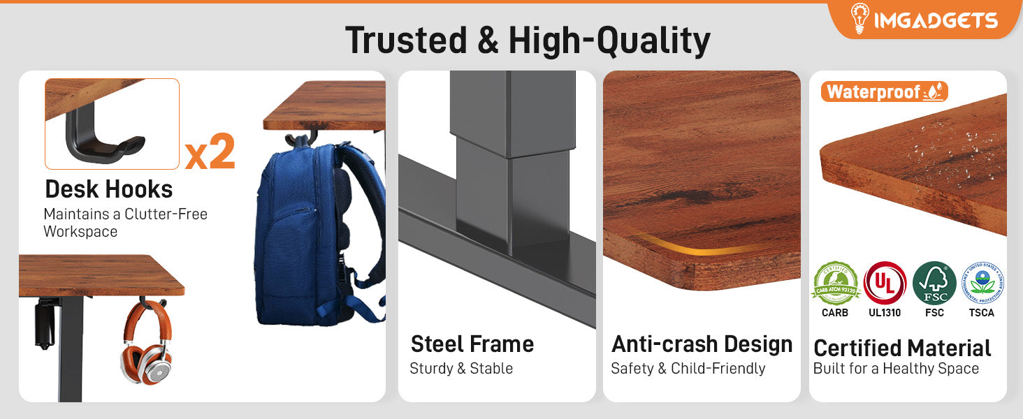 This adjustable standing desk is waterproof, anti-scratch, and equipped with smart holders and desk hooks for accessories, ensuring a neat and organized workspace. Perfect for anyone seeking a premium computer desk table, office desk, or sit-stand desk to boost productivity and comfort.