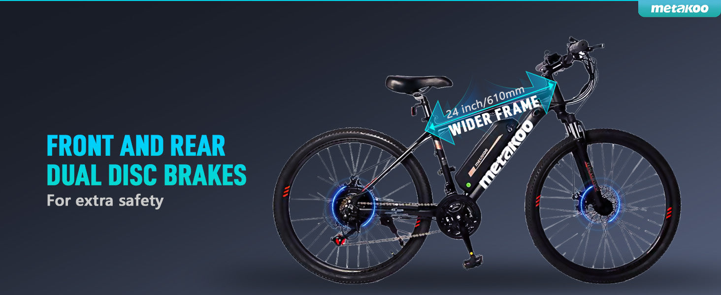 • Dual Disk Brakes and Suspension: To enhance the riding experience, this mountain electric bike features a sturdy aluminum alloy frame built to withstand wear and tear. It is equipped with a front suspension fork to a smooth and comfortable ride further. The Cybertrack c-100 e-bike also incorporates mechanical disc brakes that deliver powerful and responsive braking, ensuring safety even in challenging weather conditions.